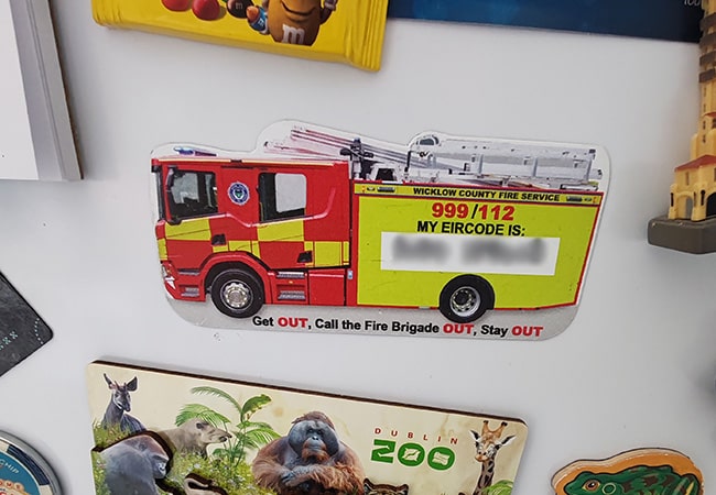 Fridge magnet provided by Wicklow County Fire Service with space for Eircode in case of emergencies.
