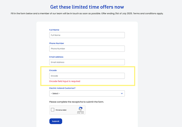 Electric Ireland website requesting Eircode instead of an address on solar panel enquiry form.