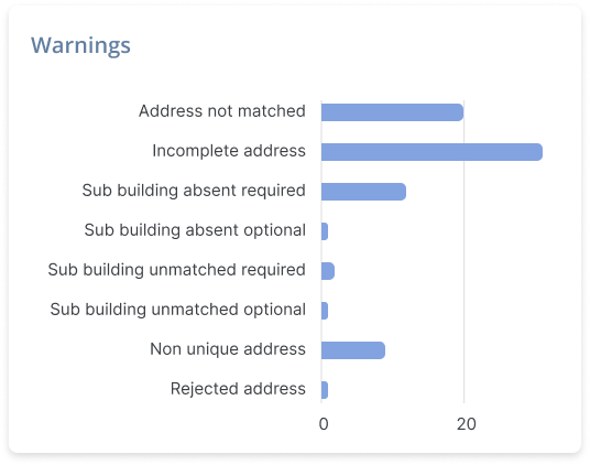 The Warnings report section provides a breakdown of the times we would prompt the user to confirm or correct their address, such as a non-unique rural address missing an Eircode, or a missing apartment number.